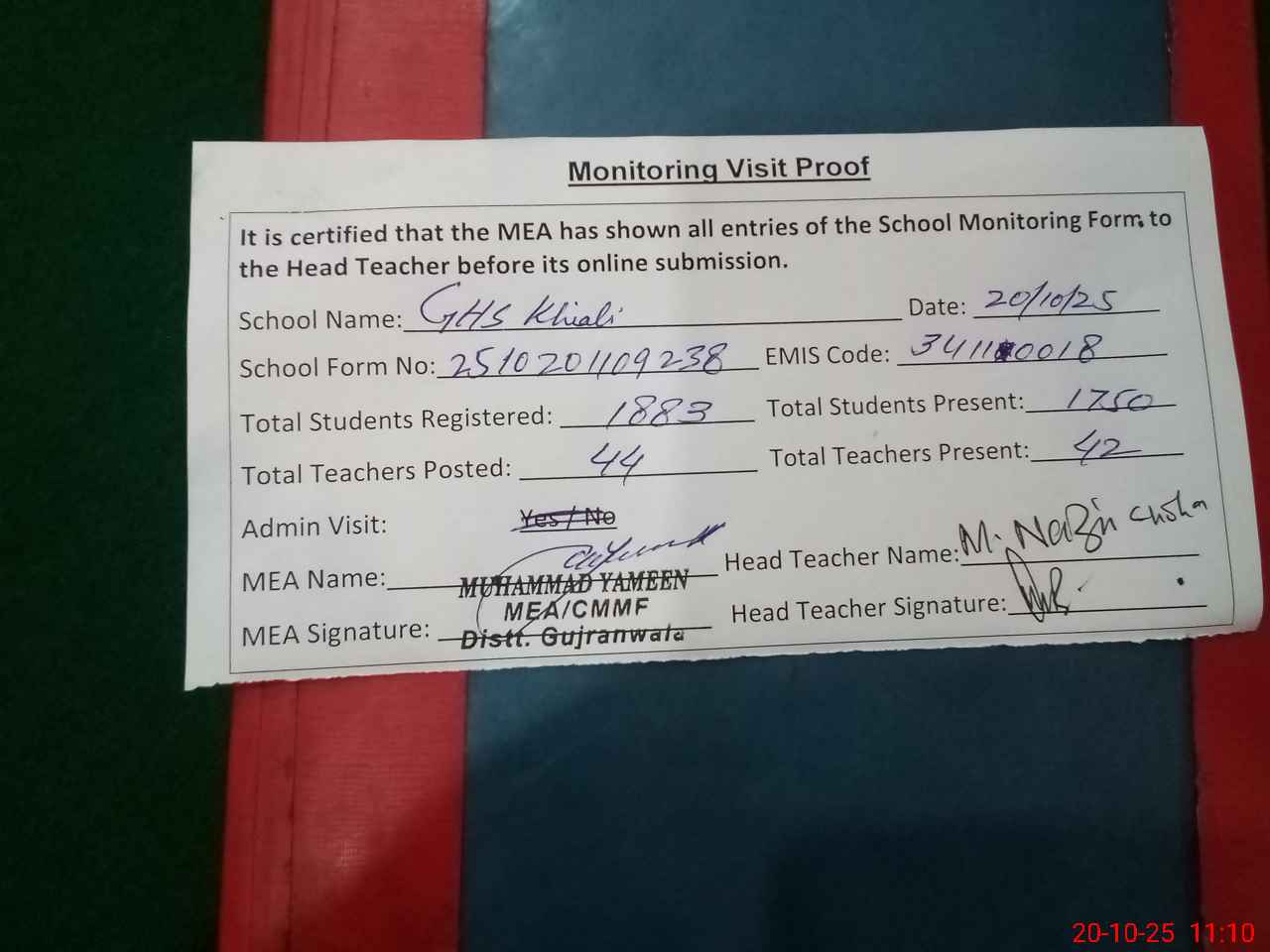 | Attendance Register | Head Teacher | MEA with School | Visit Proof |