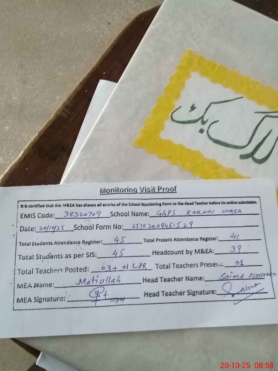 | Attendance Register | Head Teacher | MEA with School | Visit Proof |