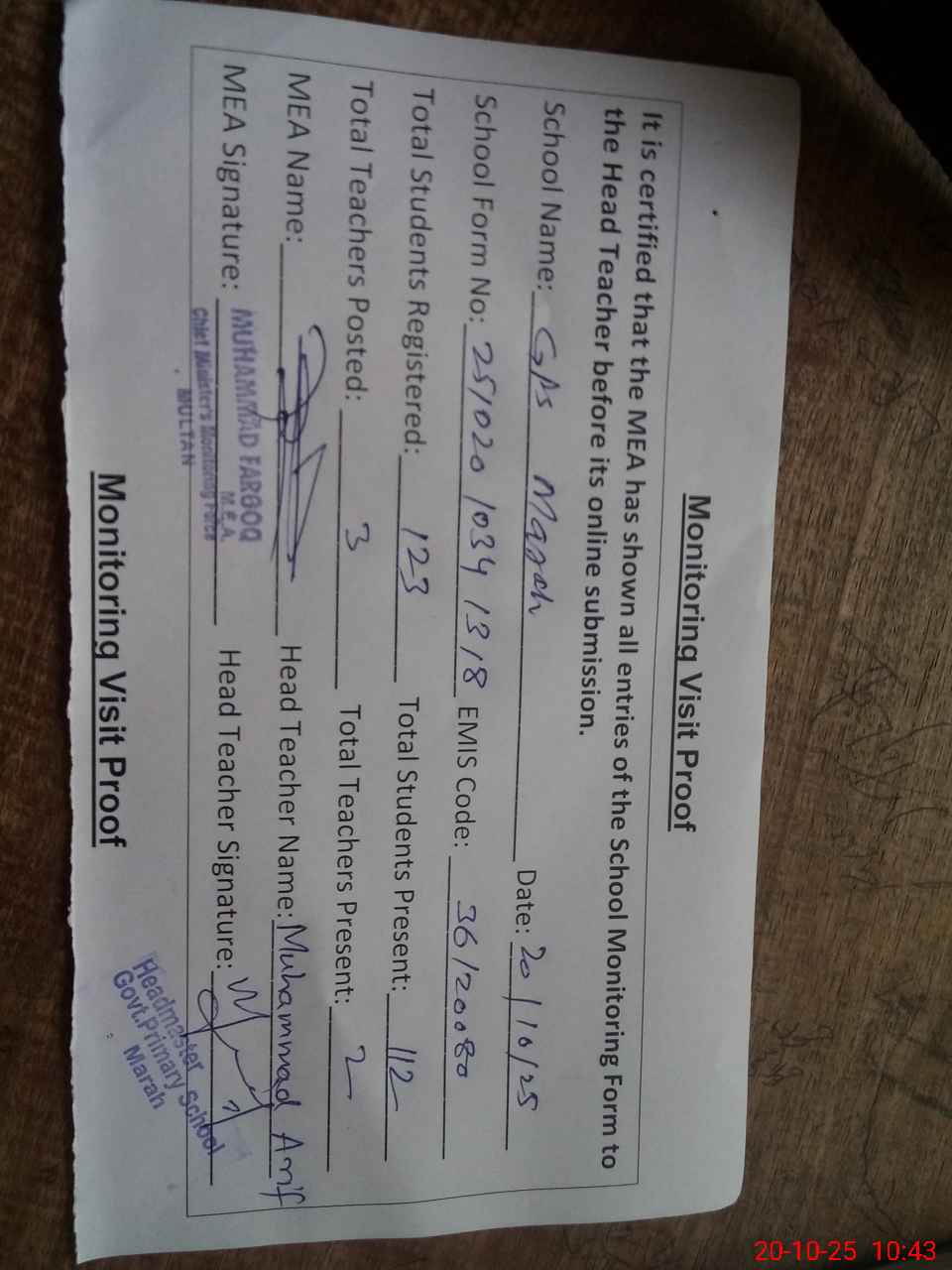 | Attendance Register | Head Teacher | MEA with School | Visit Proof |