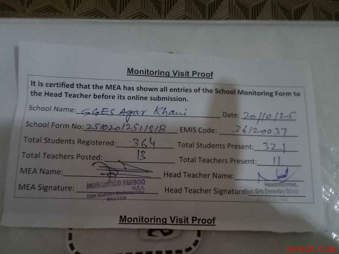 | Attendance Register | Head Teacher | MEA with School | Visit Proof |