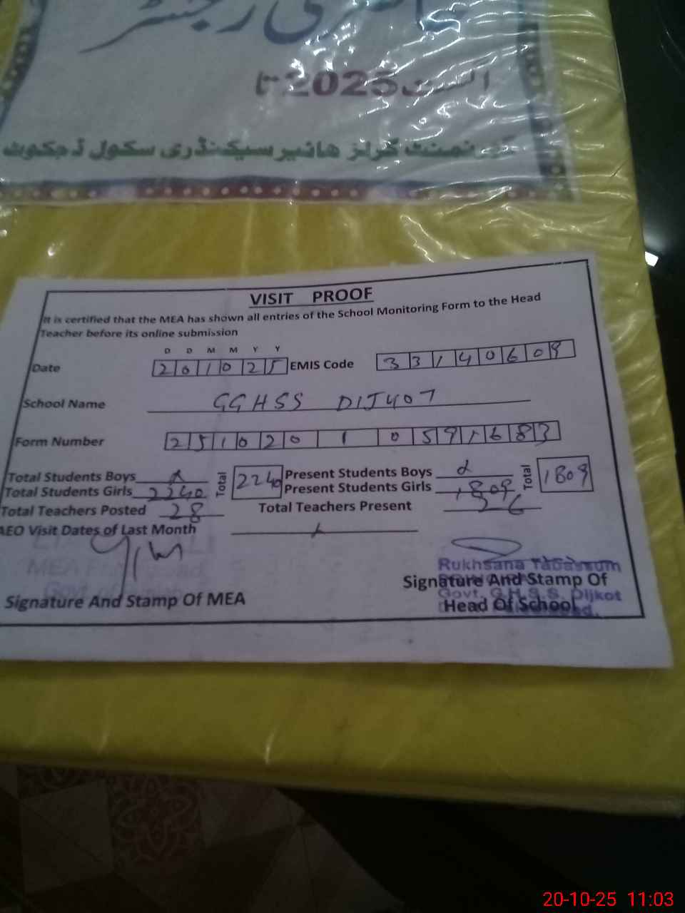 | Attendance Register | Head Teacher | MEA with School | Visit Proof |