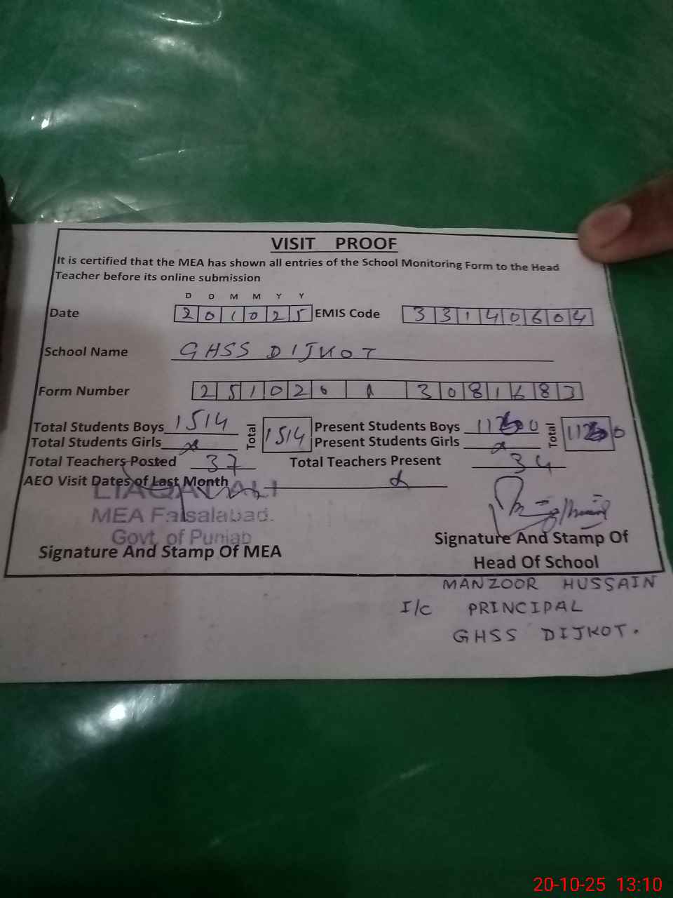 | Attendance Register | Head Teacher | MEA with School | Visit Proof |