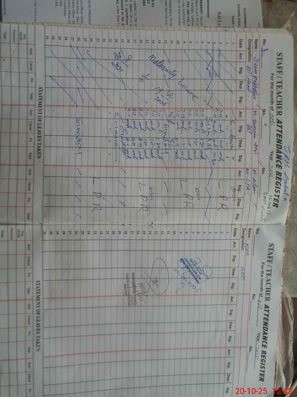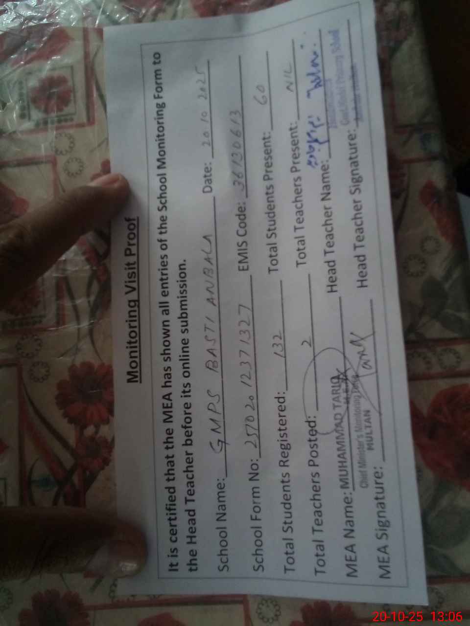 | Remarks (Use Separate Page if Required): PST IRAM MUBASHIR MATERNITY LEAVE SANCTIONED ON WRITTEN LETTER PST MUHAMMAD ASLAM ON LPR HE IS PRESENT IN SCHOOL BECAUSE BOTH TEACHERS ARE ON LEAVE SO HE CAME TO CONDUCT MEA VISIT STUDENTS ATTENDENCE LIST OF PREVIOUS SESSION TAB IS NOT AVAILABLE SO STUDENTS STRENGTH COULD NOT VERIFIED FROM SIS THERE IS SOME DIFFERENCE IN BETWEEN ROZNAMCHA AND STUDENTS ATTENDENCE REGISTER | |||||