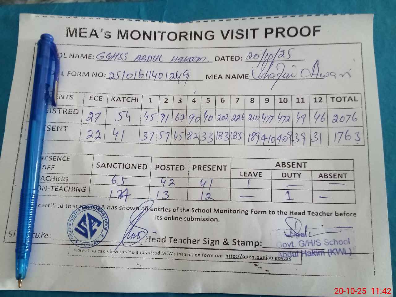 | Attendance Register | Head Teacher | MEA with School | Visit Proof |