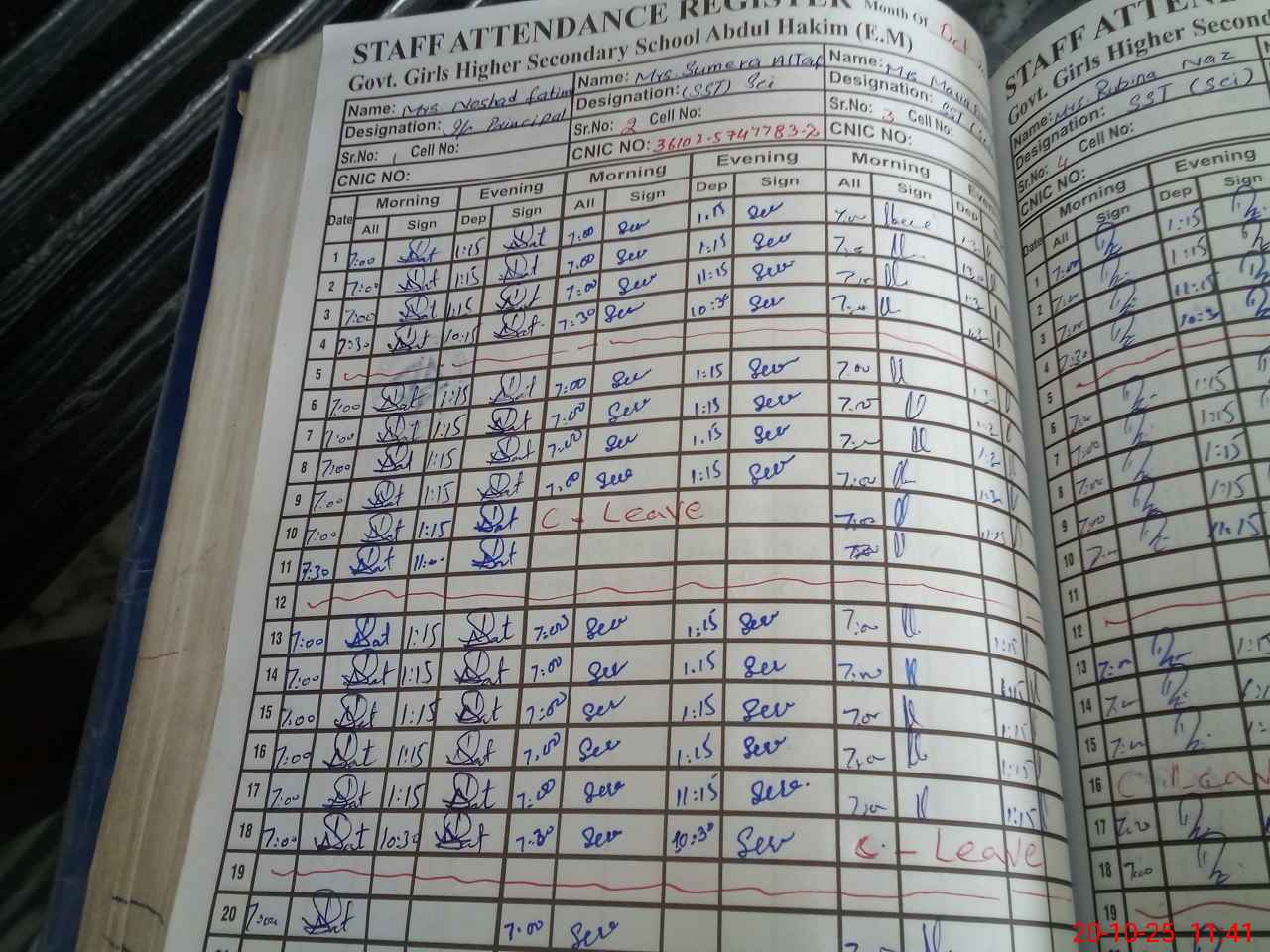 | CNIC | Full Name | Designation | R/C | Absence during last cal. month |