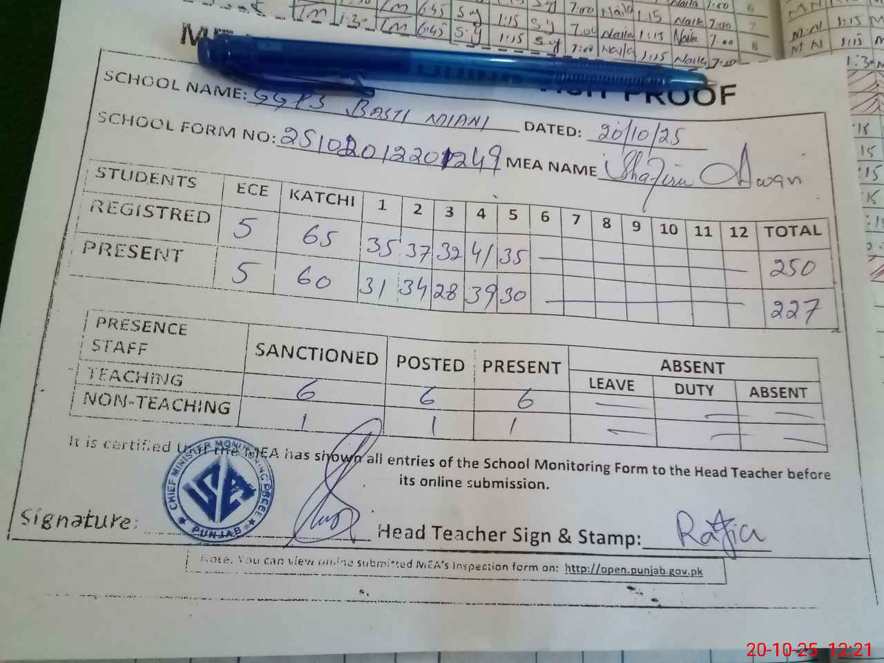 | Attendance Register | Head Teacher | MEA with School | Visit Proof |