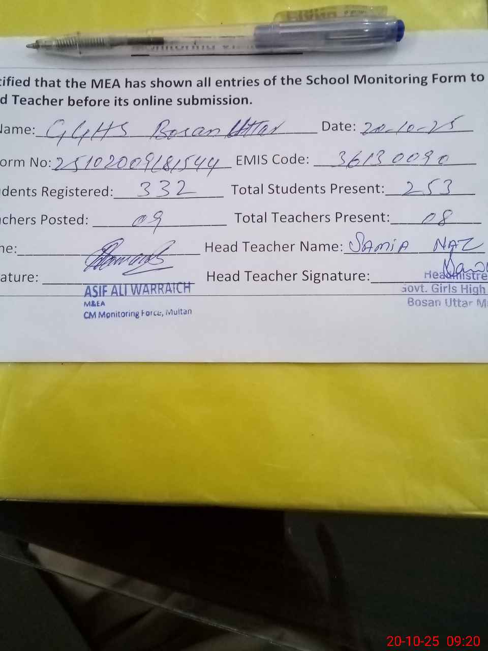 | Attendance Register | Head Teacher | MEA with School | Visit Proof |