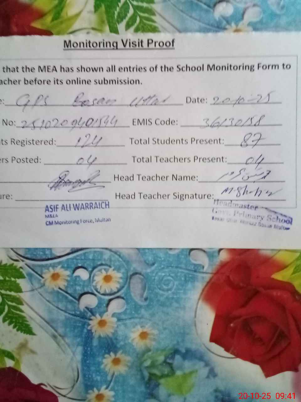 | Attendance Register | Head Teacher | MEA with School | Visit Proof |