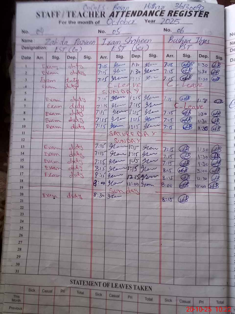 | 36**** | Za**** Pe**** | EST | Regular | 0 | 0 | 0 | 0 | 0 | 0 | 0 | 0 | 0 | Exam Duty |