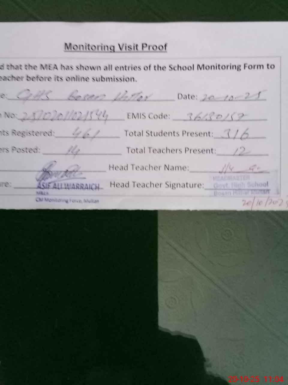 | Attendance Register | Head Teacher | MEA with School | Visit Proof |