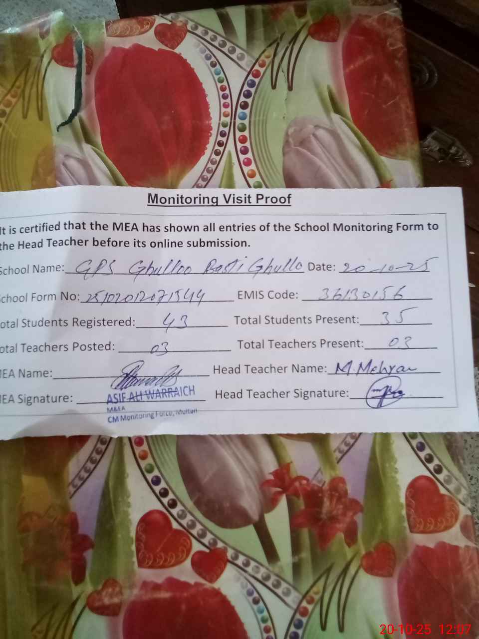 | Attendance Register | Head Teacher | MEA with School | Visit Proof |