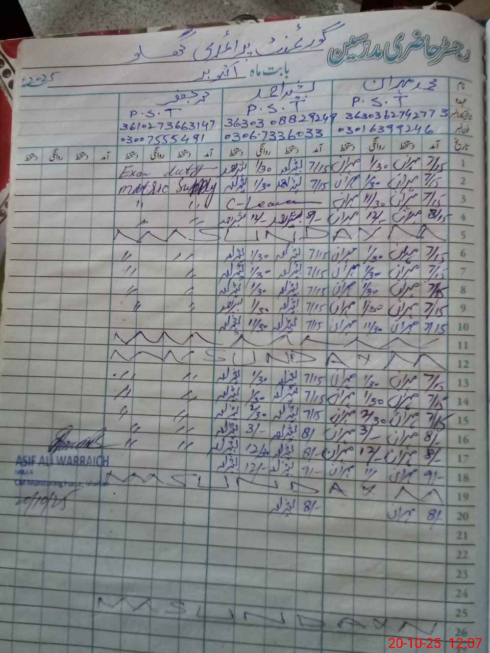 | CNIC | Full Name | Designation | R/C | Absence During Last Calender Month |