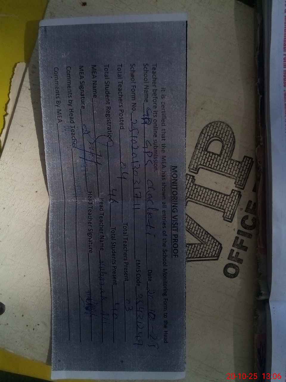 | Attendance Register | Head Teacher | MEA with School | Visit Proof |
