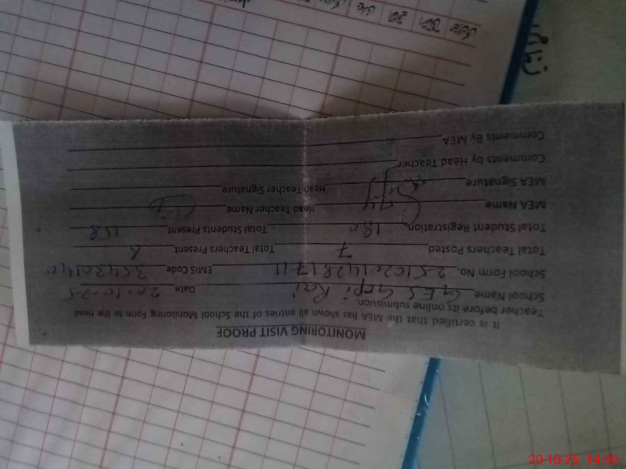 | Attendance Register | Head Teacher | MEA with School | Visit Proof |