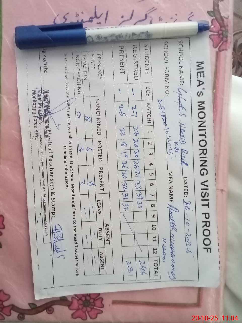 | Attendance Register | Head Teacher | MEA with School | Visit Proof |