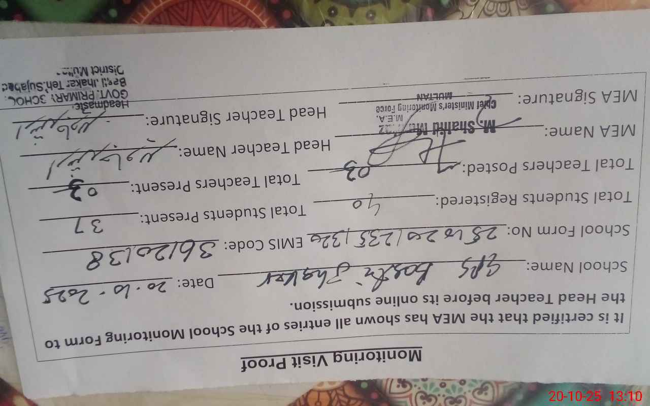 | Certified that this School was Inspected by the Undersigned MEA/DMO Today and the Information Stated Above is as Per Record. | |||||