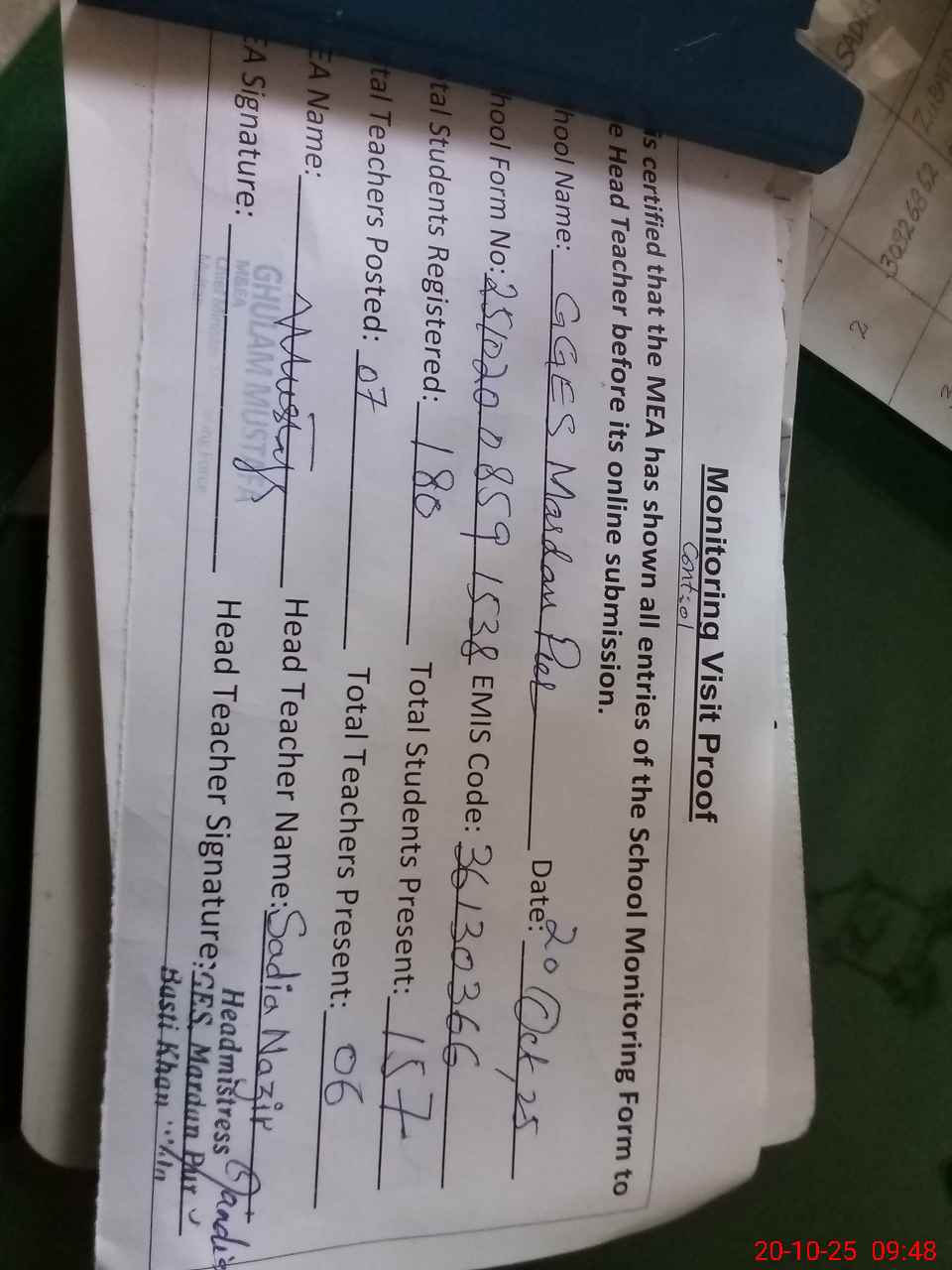 | Attendance Register | Head Teacher | MEA with School | Visit Proof |