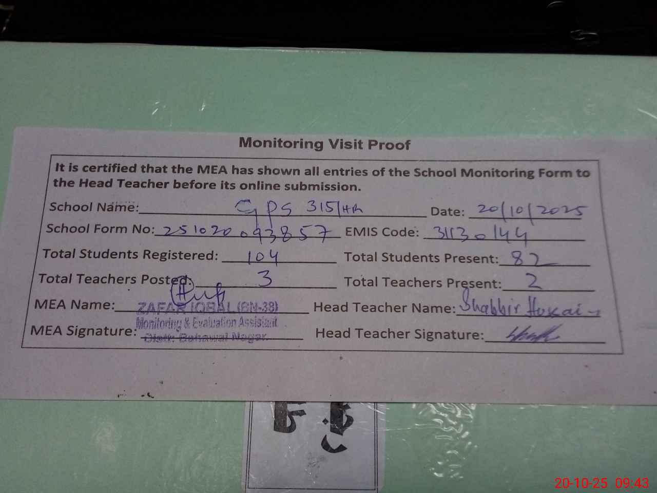 | EMIS Code: 31130144 | Name of School: GPS CHAK 315/HR | |||