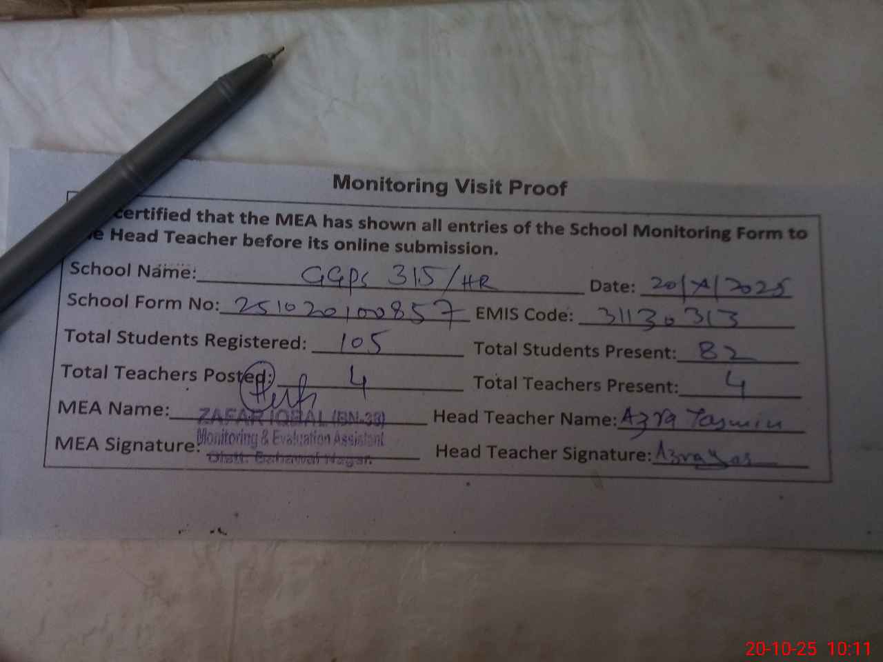 | EMIS Code: 31130313 | Name of School: GGPS CHAK 315/HR | |||
