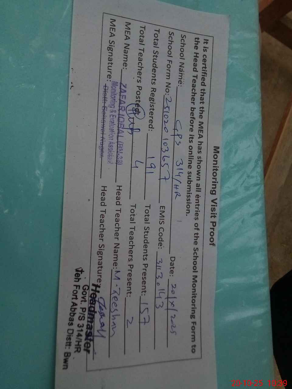 | Attendance Register | Head Teacher | MEA with School | Visit Proof |
