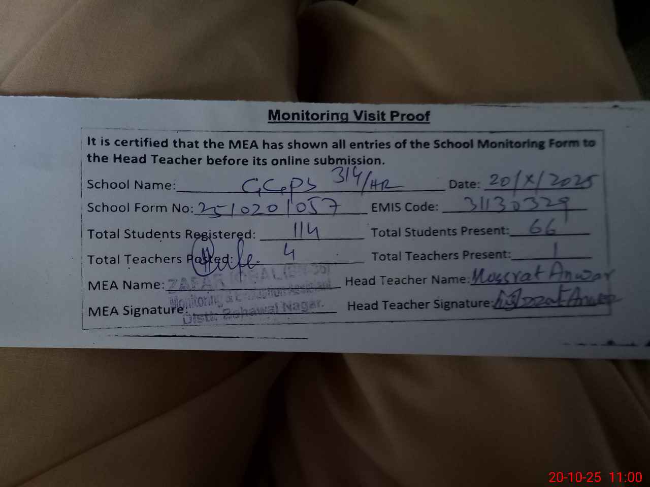 | Attendance Register | Head Teacher | MEA with School | Visit Proof |