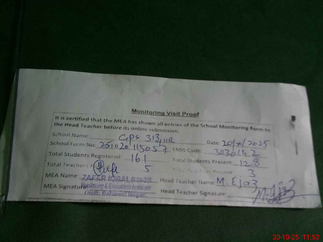 | Attendance Register | Head Teacher | MEA with School | Visit Proof |