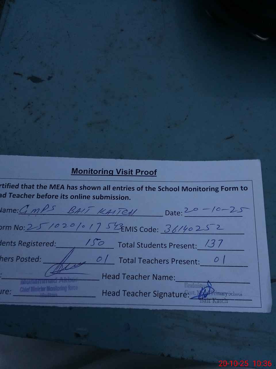 | Attendance Register | Head Teacher | MEA with School | Visit Proof |