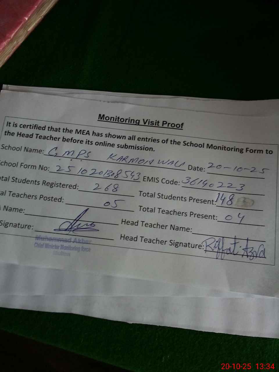 | Attendance Register | Head Teacher | MEA with School | Visit Proof |