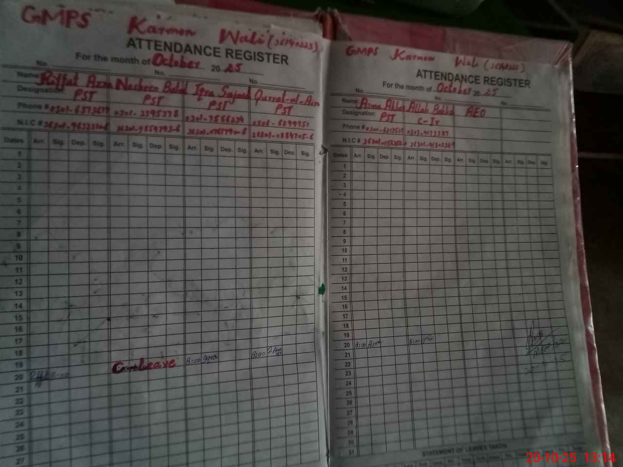 | CNIC | Full Name | Designation | R/C | Absence During Last Calender Month |