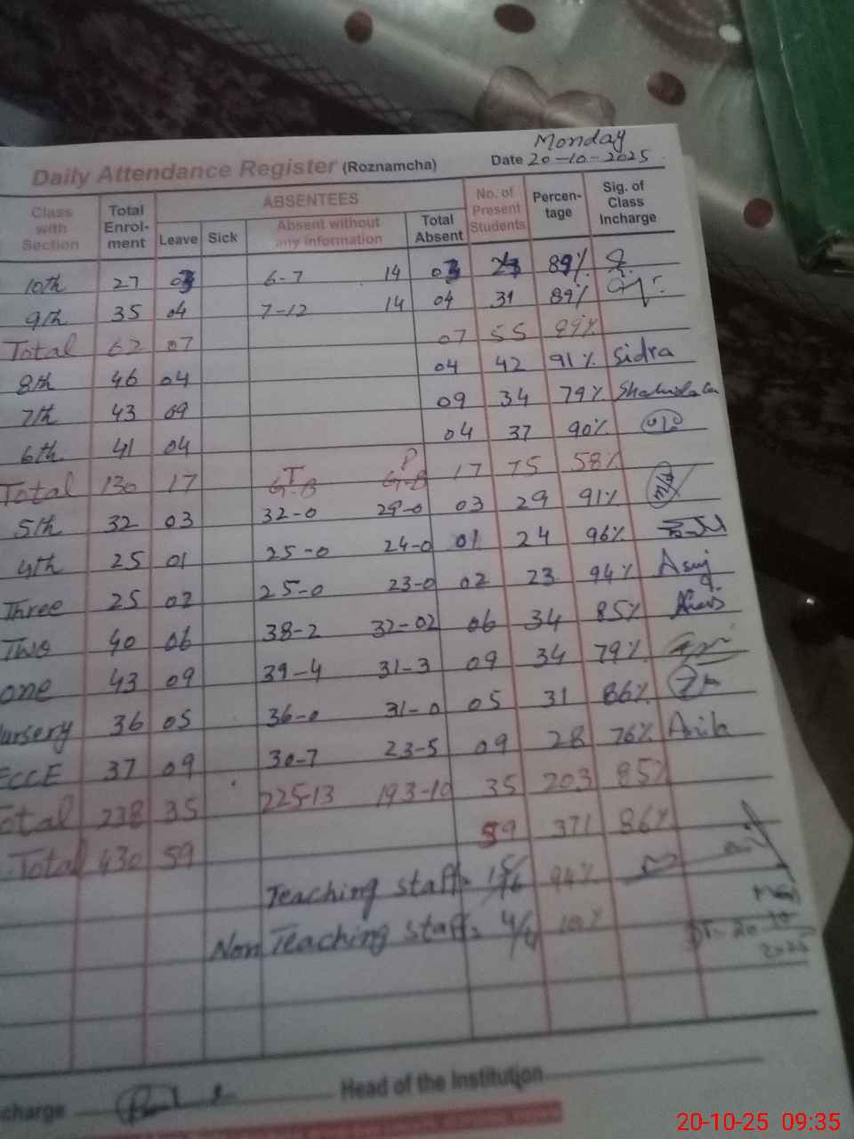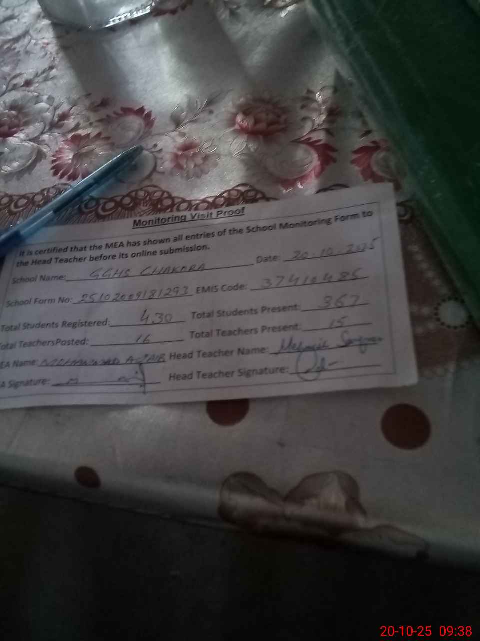 | Attendance Register | Head Teacher | MEA with School | Visit Proof |