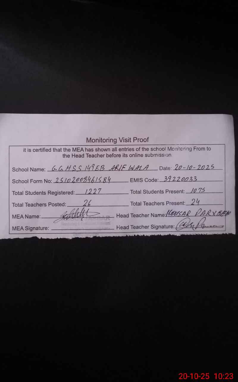 | EMIS Code: 39220033 | Name of School: GGHSS 149 EB ARIFWALA | |||