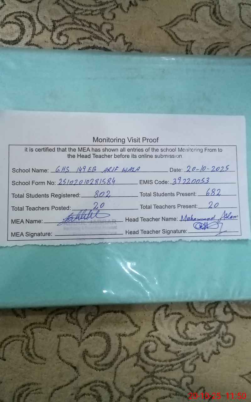 | EMIS Code: 39220053 | Name of School: GHS 149 EB ARIF WALA | |||