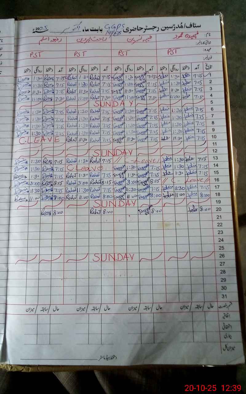 | CNIC | Full Name | Designation | R/C | Absence During Last Calender Month |