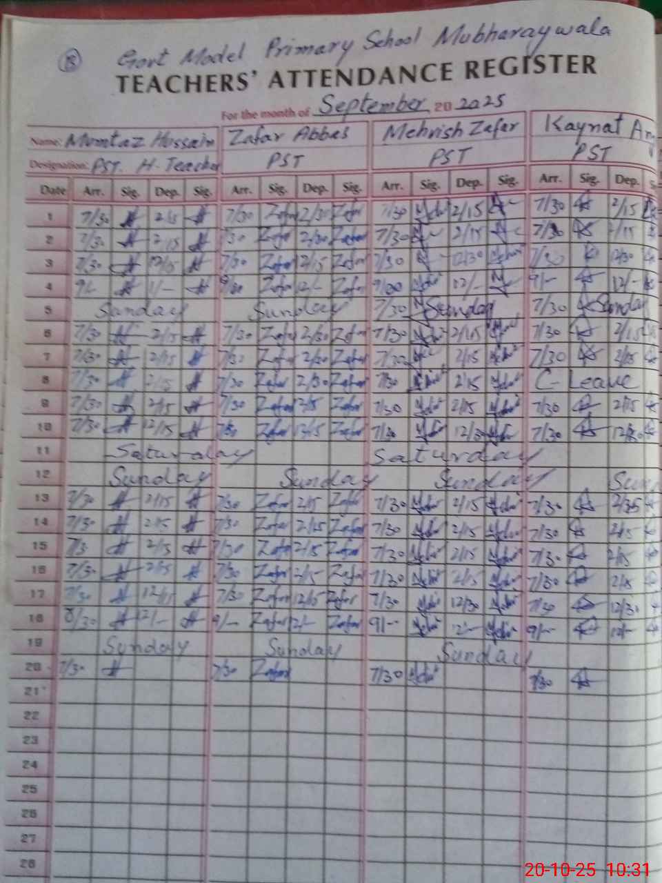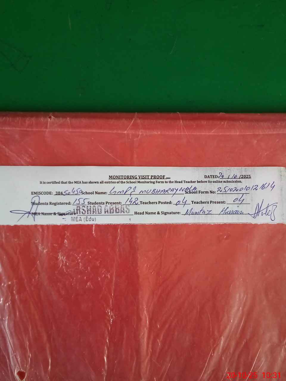 | Attendance Register | Head Teacher | MEA with School | Visit Proof |