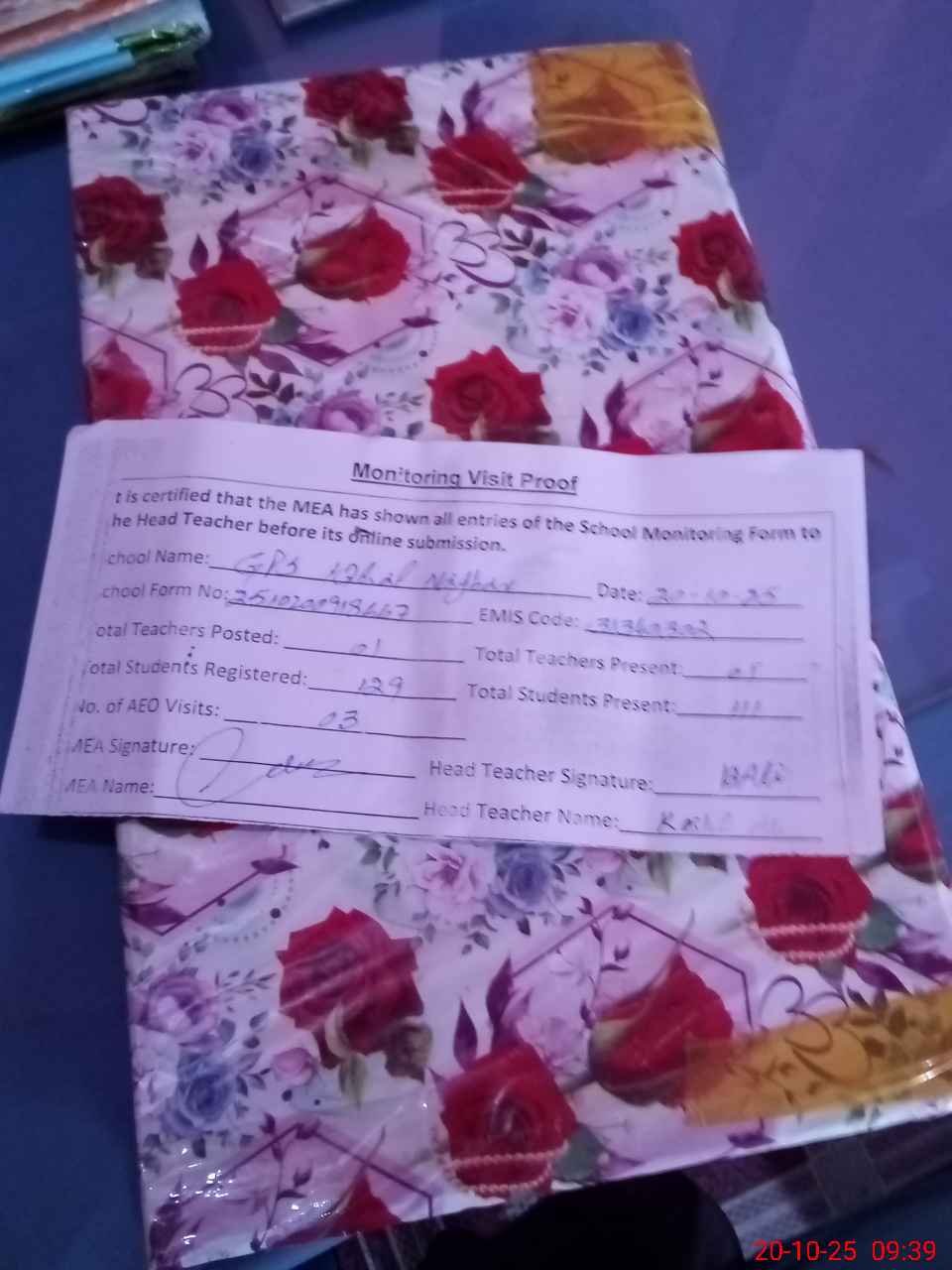 | Attendance Register | Head Teacher | MEA with School | Visit Proof |