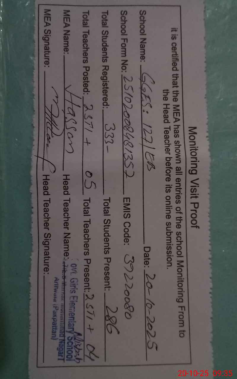| Attendance Register | Head Teacher | MEA with School | Visit Proof |