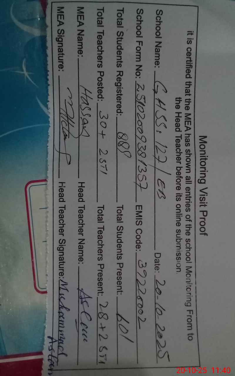 | Attendance Register | Head Teacher | MEA with School | Visit Proof |