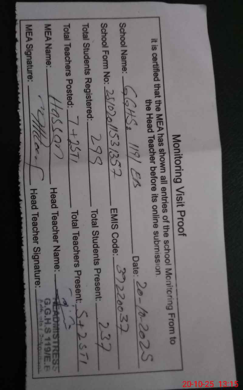 | EMIS Code: 39220037 | Name of School: GGHS 119 EB | |||