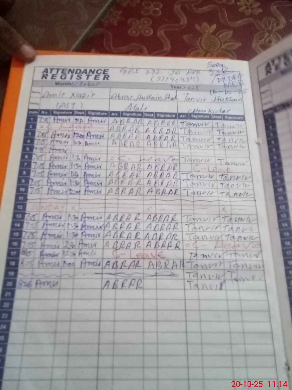 | CNIC | Full Name | Designation | R/C | Absence During Last Calender Month |