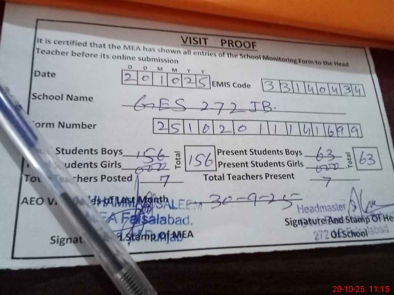 | Attendance Register | Head Teacher | MEA with School | Visit Proof |