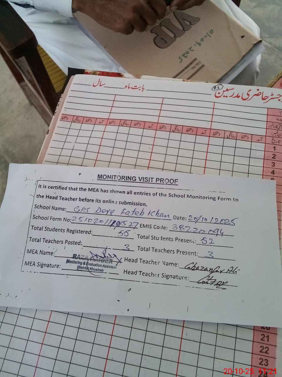 | Attendance Register | Head Teacher | MEA with School | Visit Proof |
