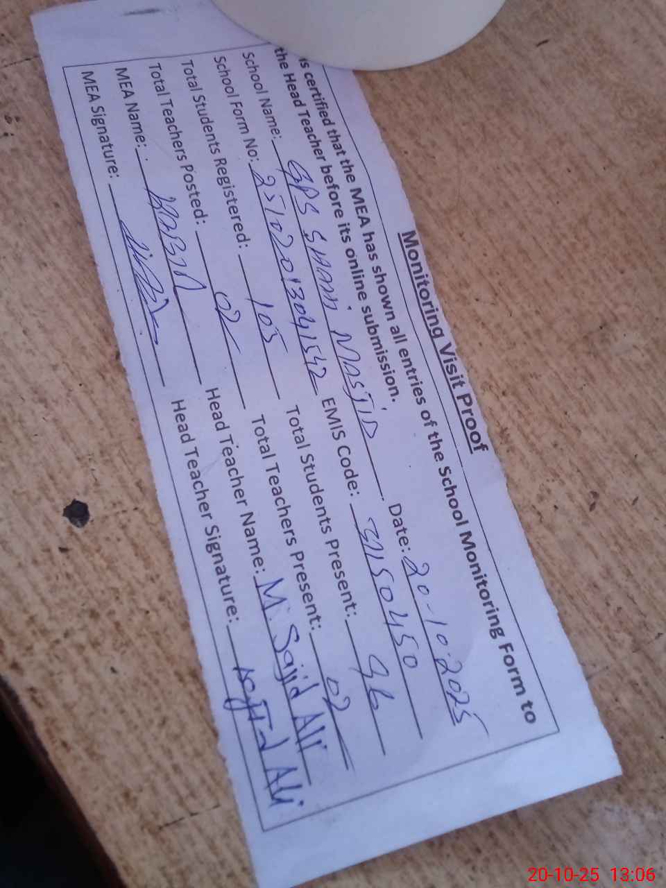 | Attendance Register | Head Teacher | MEA with School | Visit Proof |