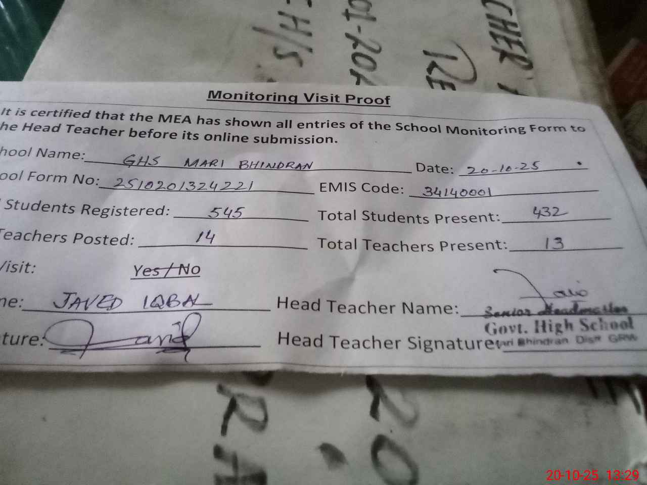| Attendance Register | Head Teacher | MEA with School | Visit Proof |