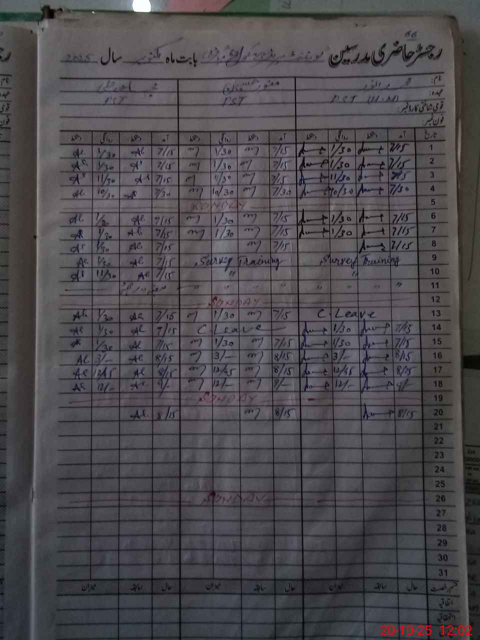 | CNIC | Full Name | Designation | R/C | Absence During Last Calender Month |