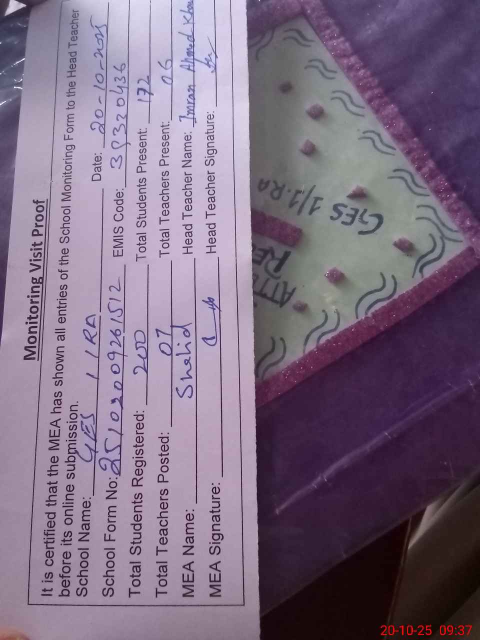 | Attendance Register | Head Teacher | MEA with School | Visit Proof |