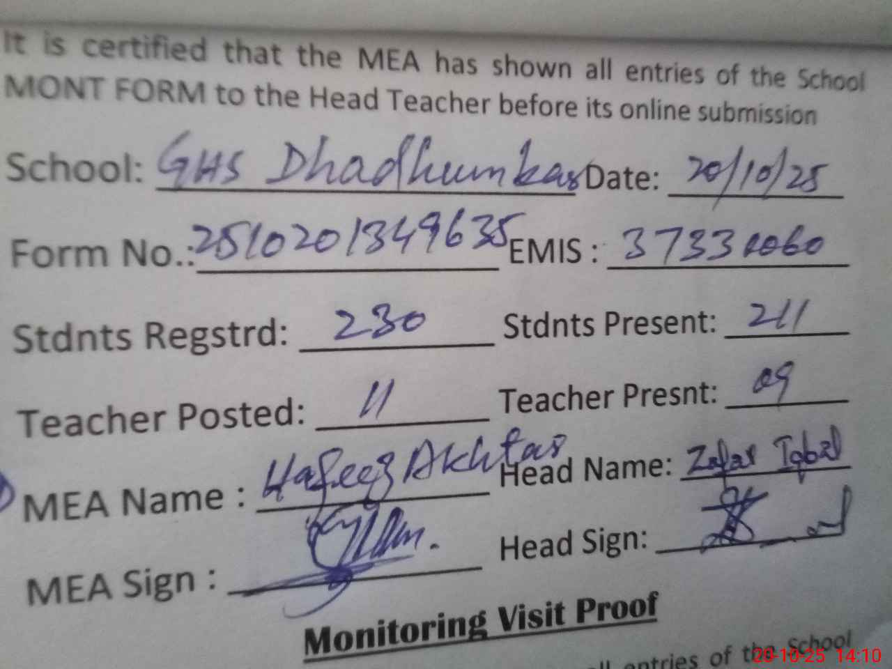| Certified that this School was Inspected by the Undersigned MEA/DMO Today and the Information Stated Above is as Per Record. | |||||
