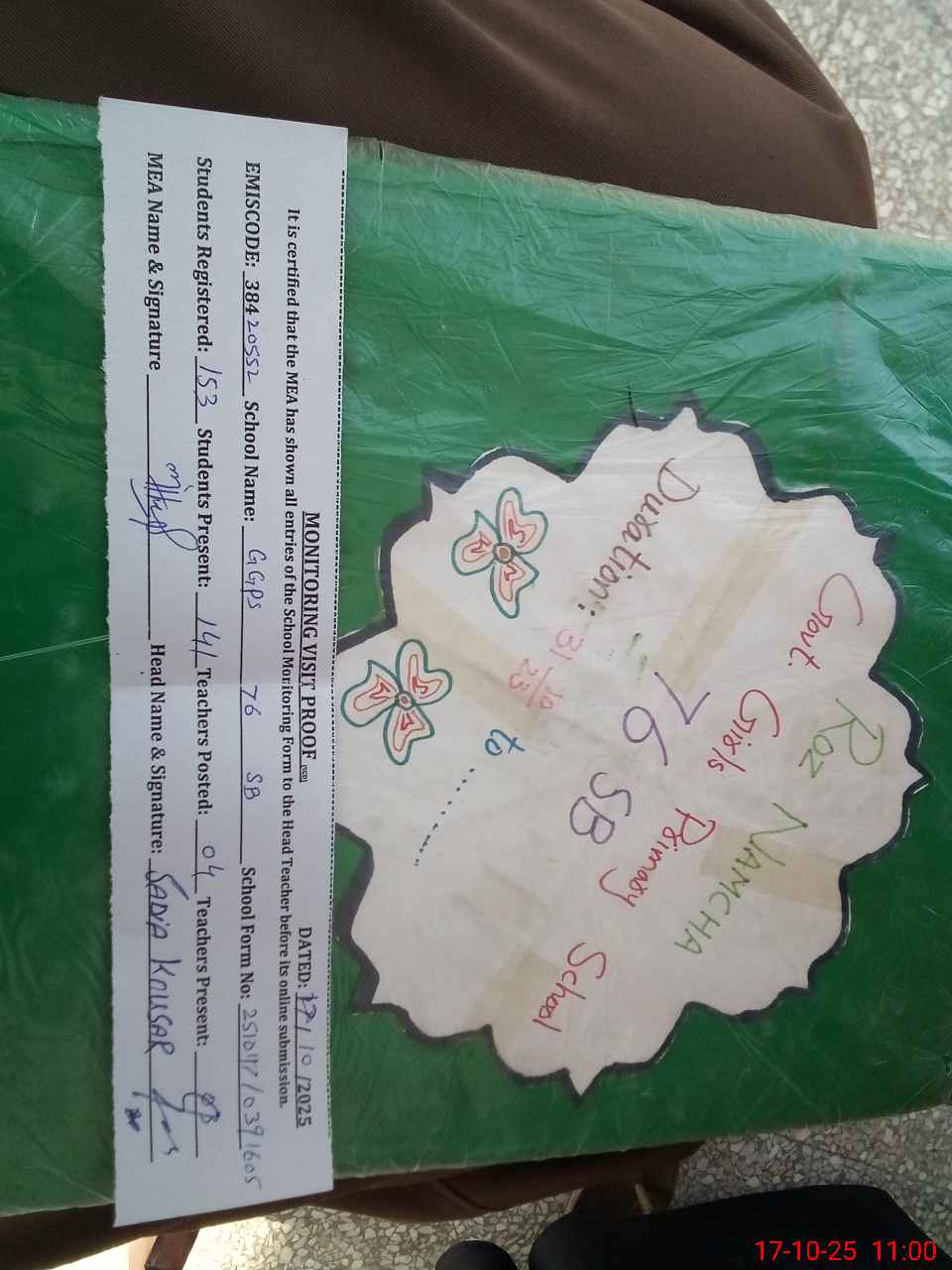 | Attendance Register | Head Teacher | MEA with School | Visit Proof |