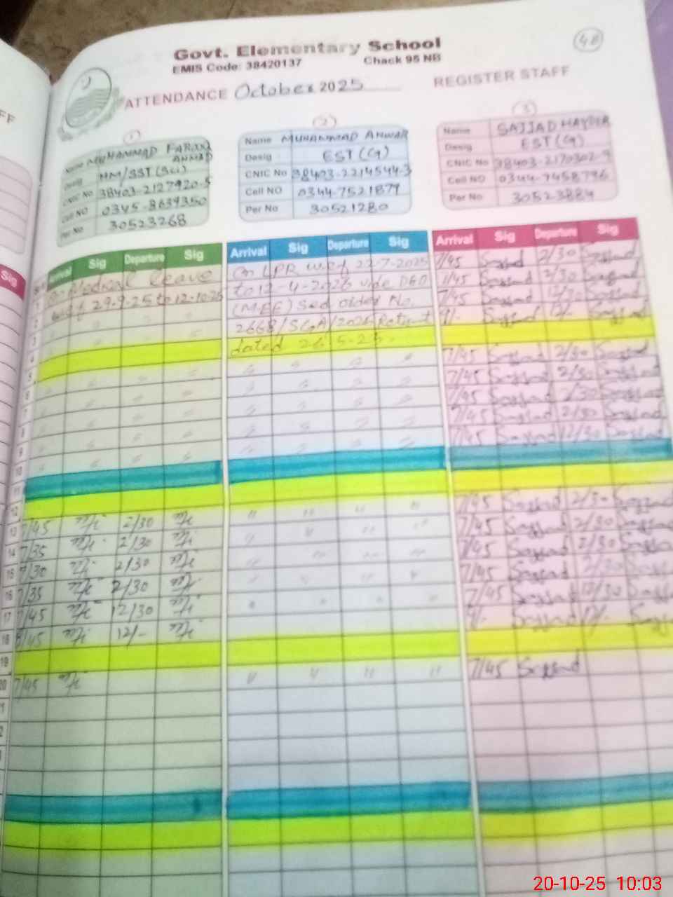 | CNIC | Full Name | Designation | R/C | Absence during last cal. month |