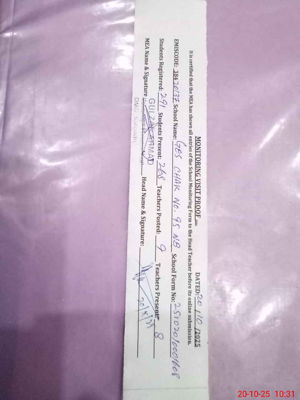 | Attendance Register | Head Teacher | MEA with School | Visit Proof |