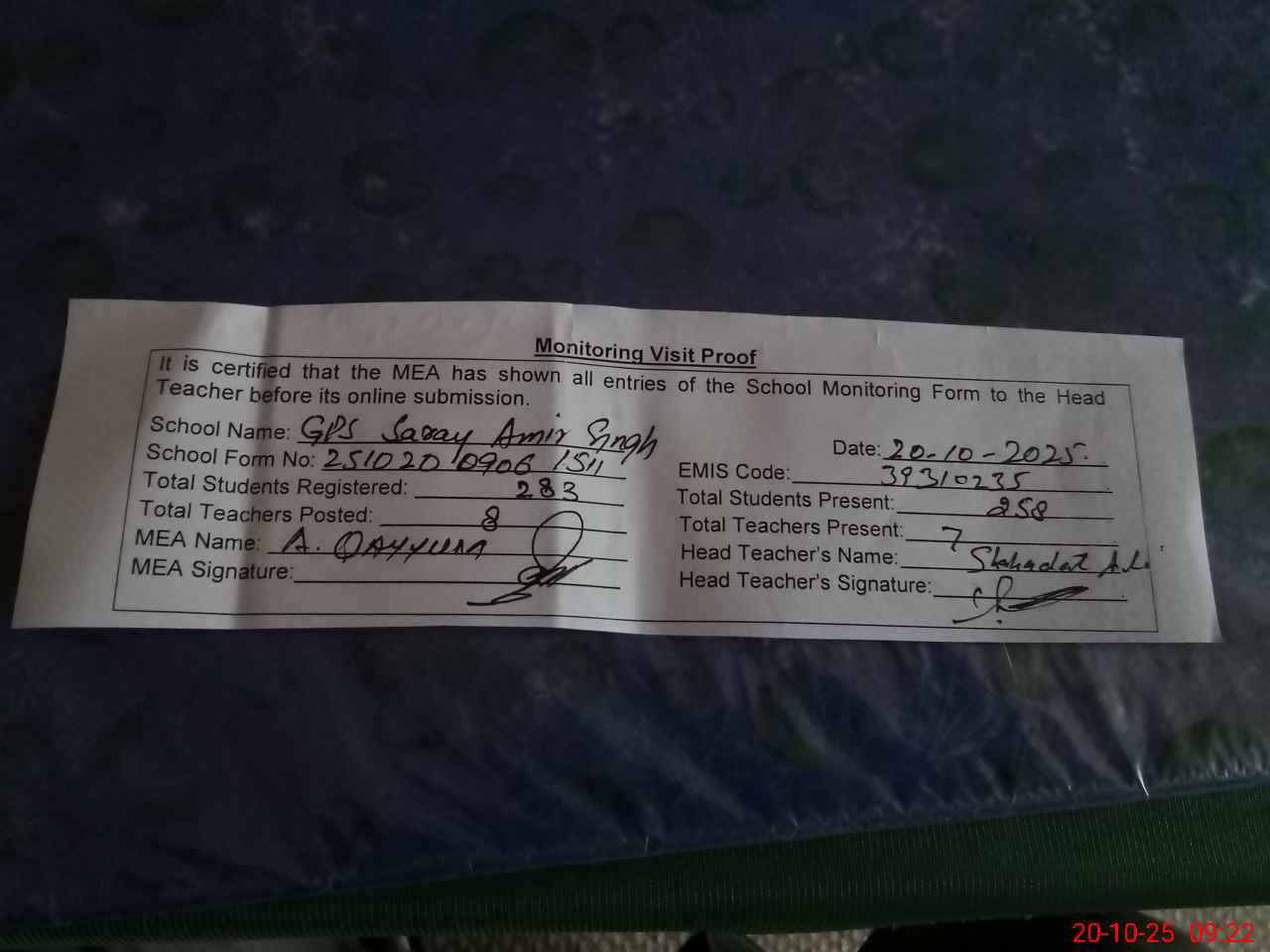| Monitoring Date: 20-10-2025 | Start Time: 20-10-2025 08:53 AM | End Time: 20-10-2025 09:22 AM | Name of MEA: AB**** QA**** | |